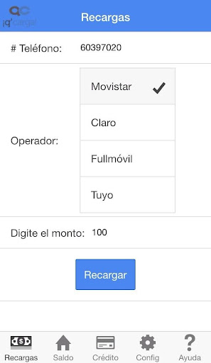 Aplicación para que los comercios afiliados a la red Q’Carga puedan realizar las recargas telefónicas a sus clientes; funciona con el mismo usuario y clave que se utiliza en los medios tradicionales por mensajes de texto o página WEB.