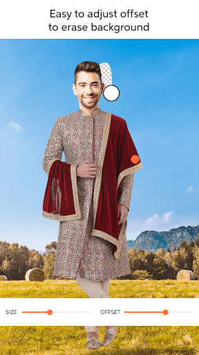 Do you want to look like a royal king or a handsome groom with ethnic sherwanis, but finding them too expensive to purchase then this photo editor is the best solution for you. First of all you need to insert your recent photograph from your mobile phones gallery or you can click a new one. Crop your face from the photo using our freehand crop tool, it allows you to crop the image with high accuracy. With erase tool remove the extra part of image, you can also adjust the eraser’s size according to your convenience. From the offset tool you can increase or decrease the distance of eraser and your thumb pointer to make editing more convenient. With the repair tool you can bring back the portion of image which you have erased by mistake. In repair too also you can adjust the size and offset just like the eraser tool. From undo and redo buttons you can correct your mistakes easily which will make your editing quicker. You can bring back the exact cropped image back by clicking the reset button.